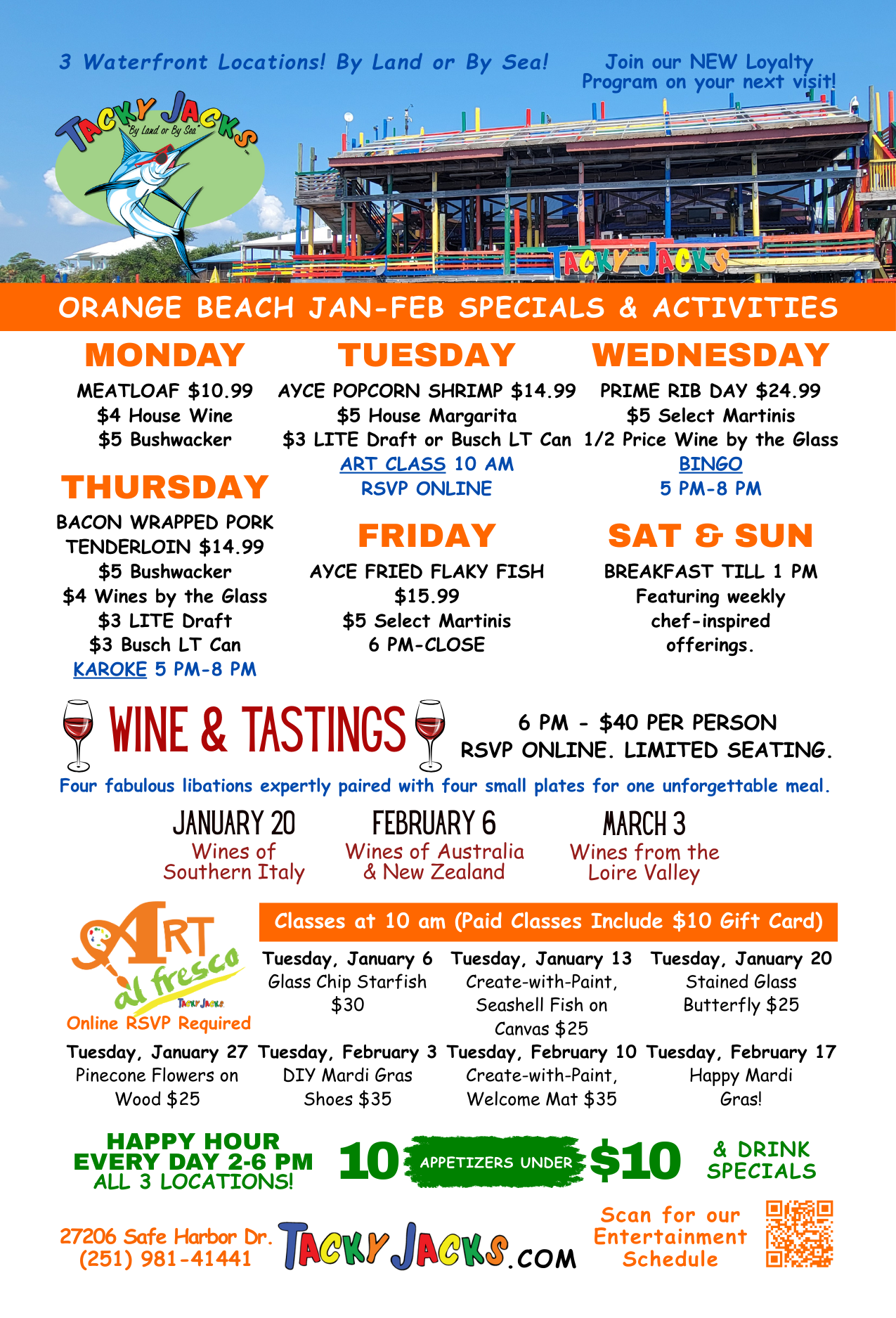 Casual waterfront dining overlooking the Perdido Pass Bridge on Cotton Bayou, our friendly experienced staff, great food and award an winning Happy Hour make Tacky Jacks the locals’ favorite hangout for over 38 years.
